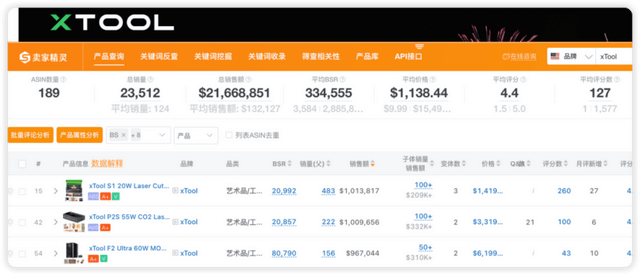 xTool正在亚马逊美邦站的发挥特出。卖家精灵sellersprite数据显示,近来30天,正在xTool品牌下,销量排名前189的ASIN,预估总销量约2.35万单,总发售额约2166.9万美金。(该数据为估算,可以含个人跟卖及品牌授权,实质销量或受新品上架、行动节律等成分影响而颠簸。)